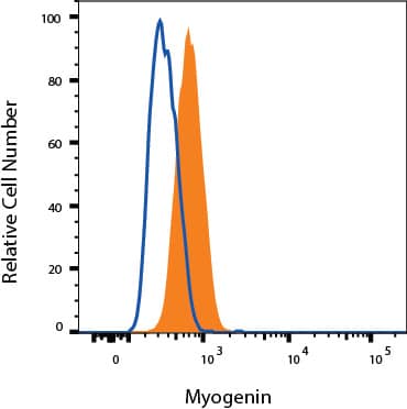 C2C12 cells were stained with Mouse Anti-Human/Mouse Myogenin Monoclonal Antibody (Catalog # MAB6686, filled histogram) or isotype control antibody (Catalog # MAB002, open histogram), followed by Fluorescein-conjugated Anti-Mouse IgG Secondary Antibody (Catalog # F0103B). To facilitate intracellular staining, cells were fixed and permeabilized with FlowX FoxP3 Fixation & Permeabilization Buffer Kit (Catalog # FC012). View our protocol for Staining Intracellular Molecules.Applications for Human/Mouse Myogenin Antibody