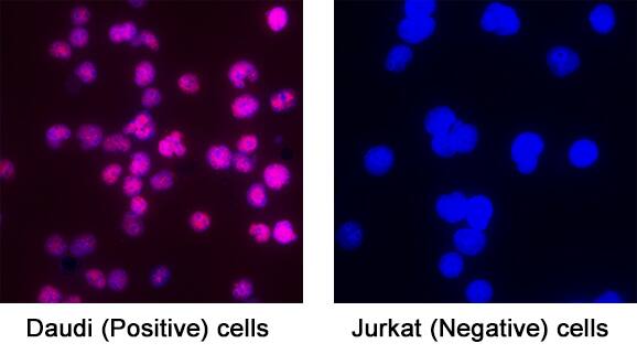 Sample: Immersion fixed Daudi human Burkitt's lymphoma cell line (Positive) & Jurkat human acute T cell leukemia cell line (Negative)