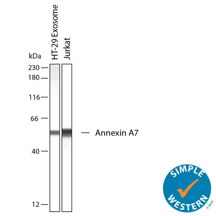Simple Western shows lysates of Exosome Standards (HT-29) (NBP3-11685) and Jurkat human acute T cell leukemia cell line, loaded at 0.5 mg/ml. A specific band was detected for Annexin A7 at approximately 55 kDa (as indicated) using 10 µg/mL of Goat Anti-Human/Mouse/Rat Annexin A7 Antigen Affinity-purified Polyclonal Antibody (Catalog # AF3926). This experiment was conducted under reducing conditions and using the 12-230kDa separation system.Applications for Human/Mouse/Rat Annexin A7 Antibody