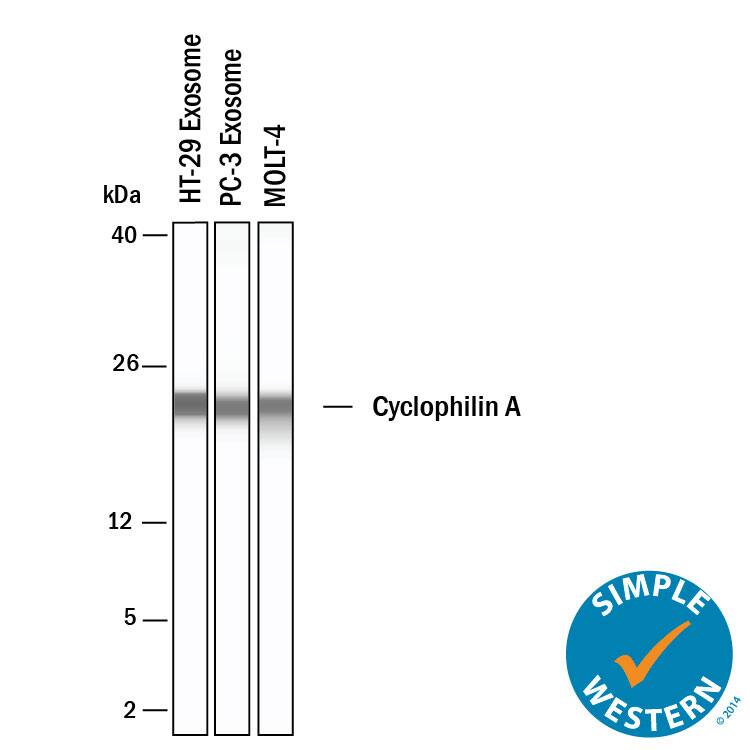 Simple Western shows lysates of Exosome Standards (HT-29) (NBP3-11685), Exosome Standards (PC-3) (NBP2-49856) and MOLT-4 human acute lymphoblastic leukemia cell line, loaded at 0.5 mg/ml. A specific band was detected for Cyclophilin A at approximately 23 kDa (as indicated) using 50 µg/mL of Goat Anti-Human/Mouse/Rat Cyclophilin A Antigen Affinity-purified Polyclonal Antibody (Catalog # AF3589). This experiment was conducted under reducing conditions and using the 2-40kDa separation system.Cyclophilin A in PANC-1 Human Cell Line.