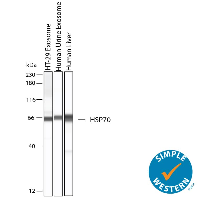 Simple Western shows lysates of Exosome Standards (HT-29) (NBP3-11685), Exosome Standards (Human Urine) (NBP2-49840) and human liver tissue, loaded at 0.5 mg/ml. A specific band was detected for HSP70/HSPA1A at approximately 67 kDa (as indicated) using 20 µg/mL of Rabbit Anti-Human/Mouse/Rat HSP70/HSPA1A Antigen Affinity-purified Polyclonal Antibody (Catalog # AF1663). This experiment was conducted under reducing conditions and using the 12-230kDa separation system.Detection of Human HSP70/HSPA1A by Simple WesternTM.