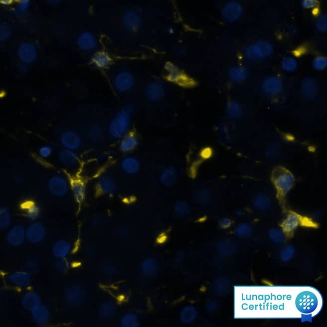 Vimentin was detected in immersion fixed paraffin-embedded sections of human colon using Rat Anti-Human/Mouse/Rat Vimentin Monoclonal Antibody (Catalog # MAB2105) at 1 µg/mL at 37 ° Celsius for 4 minutes. Before incubation with the primary antibody, tissue underwent an all-in-one dewaxing and antigen retrieval preprocessing using PreTreatment Module (PT Module) and Dewax and HIER Buffer H (pH 9). Tissue was stained using the Alexa Fluor™ Plus 647 Goat anti-Rat IgG Secondary Antibody at 1:200 at 37 ° Celsius for 2 minutes. (Yellow; Lunaphore Catalog # DR647RT) and counterstained with DAPI (blue; Lunaphore Catalog # DR100). Specific staining was localized to the cytoplasm and cytoskeleton. Protocol available in COMET™ Panel Builder.Detection of Vimentin in Human Liver via seqIF™ staining on COMET™