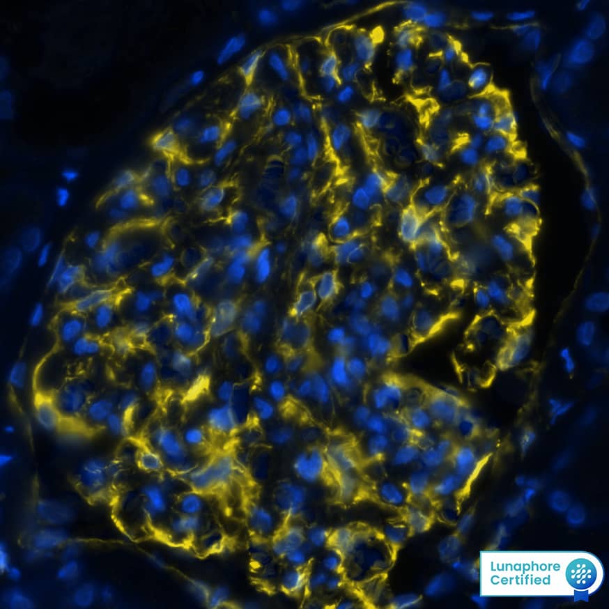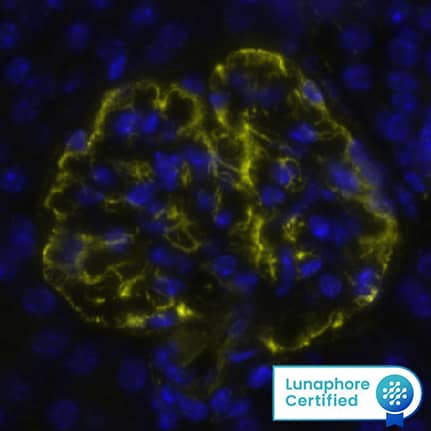 Vimentin was detected in immersion fixed paraffin-embedded sections of human liver using Rat Anti-Human/Mouse/Rat Vimentin Monoclonal Antibody (Catalog # MAB2105) at 1 µg/mL at 37 ° Celsius for 4 minutes. Before incubation with the primary antibody, tissue underwent an all-in-one dewaxing and antigen retrieval preprocessing using PreTreatment Module (PT Module) and Dewax and HIER Buffer H (pH 9; Epredia Catalog # TA-999-DHBH). Tissue was stained using the Alexa Fluor™ 647 Goat anti-Rat IgG Secondary Antibody at 1:200 at 37 ° Celsius for 2 minutes. (Yellow; Lunaphore Catalog # DR647RT) and counterstained with DAPI (blue; Lunaphore Catalog # DR100). Specific staining was localized to the cytoplasm and cytoskeleton. Protocol available in COMET™ Panel Builder.Detection of Vimentin in Human Kidney via seqIF™ staining on COMET™