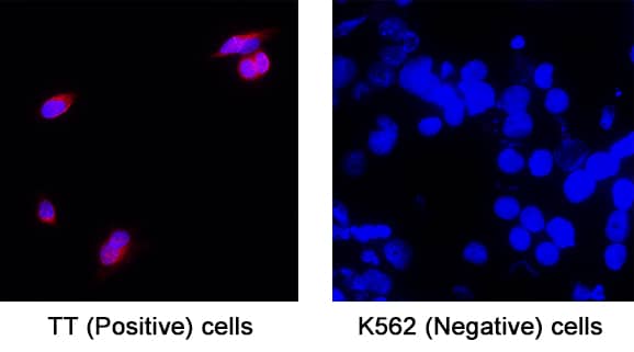 Sample: Immersion fixed human embryonic stem cells differentiated into pancreatic cells and betaTC‑6 mouse beta cell insulinoma cell line, TT human medullary thyroid cancer cell line (Positive) & K562 human chronic myelogenous leukemia cell line (Negative)