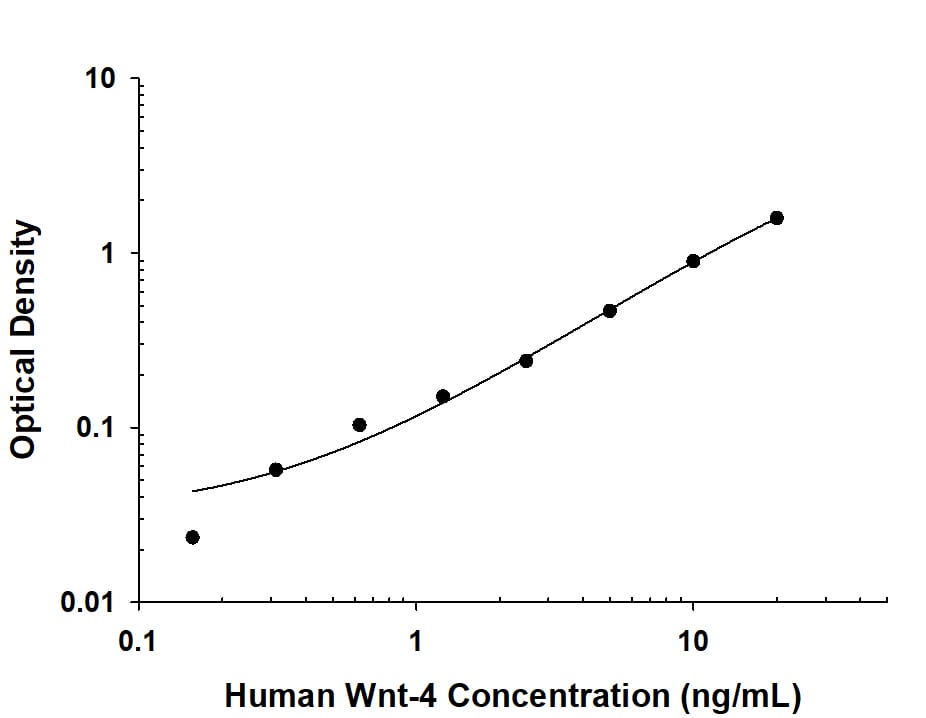 Recombinant Human Wnt-4 protein was serially diluted 2-fold and captured by Rat Anti-Human/Mouse Wnt-4 Monoclonal Antibody (Catalog # MAB475) coated on a Clear Polystyrene Microplate (DY990). Sheep Anti-Human Wnt-4 Antigen Affinity-purified Polyclonal Antibody (AF6076) was biotinylated and incubated with the protein captured on the plate. Detection of the standard curve was achieved by incubating Streptavidin-HRP (DY998) followed by Substrate Solution (DY999) and stopping the enzymatic reaction with Stop Solution (DY994).Applications for Human/Mouse Wnt-4 Antibody