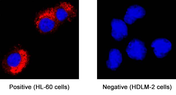 Myeloperoxidase/MPO was detected in immersion fixed HL-60 human acute promyelocytic leukemia cell line (positive staining) and HDLM-2 human Hodgkin’s lymphoma cell line (negative staining) using Goat Anti-Human Myeloperoxidase/MPO Antigen Affinity-purified Polyclonal Antibody (Catalog # AF3174) at 1.7 µg/mL for 3 hours at room temperature. Cells were stained using the NorthernLights™ 557-conjugated Anti-Goat IgG Secondary Antibody (red; NL001) and counterstained with DAPI (blue). Specific staining was localized to cytoplasm. Staining was performed using our protocol for Fluorescent ICC Staining of Non-adherent Cells.Detection of Human Myeloperoxidase/MPO by Simple WesternTM.