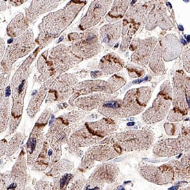 N-Cadherin was detected in immersion fixed paraffin-embedded sections of human heart using Sheep Anti-Human N-Cadherin Antigen Affinity-purified Polyclonal Antibody (Catalog # AF1388) at 1 µg/mL overnight at 4 °C. Tissue was stained using the Sheep IgG VisUCyte HRP Polymer Antibody (Catalog # VC006). Before incubation with the primary antibody, tissue was subjected to heat-induced epitope retrieval using Antigen Retrieval Reagent-Basic (Catalog # CTS013). Tissue was stained using DAB (brown) and counterstained with hematoxylin (blue). Specific staining was localized to intercalated disks between the myocardial cells. Staining was performed using our protocol for IHC Staining with VisUCyte HRP Polymer Detection Reagents.Applications for Human N-Cadherin Propeptide Antibody