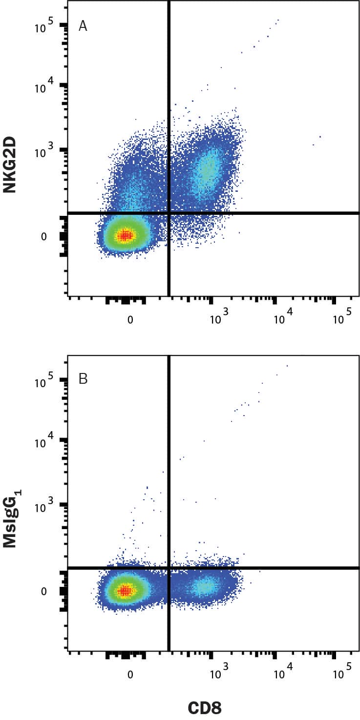 Human peripheral blood mononuclear cells (PBMCs) were stained with Mouse Anti-Human CD8 APC-conjugated Monoclonal Antibody (FAB1509A) and either (A) Mouse Anti-Human NKG2D/CD314 Monoclonal Antibody (Catalog # MAB139) or (B) Mouse IgG1 Isotype Control (MAB002) followed by anti-Mouse IgG PE-conjugated Monoclonal Antibody (F0102B). Staining was performed using our Staining Membrane-associated Proteins protocol.Detection of Human NKG2D/CD314 by Flow Cytometry