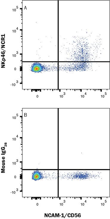 Human peripheral blood mononuclear cells (PBMCs) were stained with (A) Mouse Anti-Human NKp46/NCR1 Monoclonal Antibody (Catalog # MAB1850) or (B) Mouse IgG2B Isotype Control (MAB0041) followed by Goat anti-Mouse IgG APC-conjugated Secondary Antibody (F0101B) and Rabbit Anti-Human NCAM-1/CD56 PE-conjugated Monoclonal Antibody (FAB24086P). Staining was performed using our Staining Membrane-associated Proteins protocol.