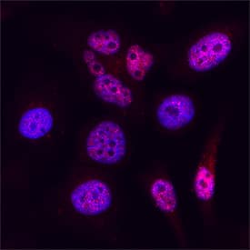 ONECUT2/OC-2 was detected in immersion fixed HeLa human cervical epithelial carcinoma cell line using Sheep Anti-Human ONECUT2/OC-2 Antigen Affinity-purified Polyclonal Antibody (Catalog # AF6294) at 5 µg/mL for 3 hours at room temperature. Cells were stained using the NorthernLights™ 557-conjugated Anti-Sheep IgG Secondary Antibody (red; NL010) and counterstained with DAPI (blue). Specific staining was localized to cell nuclei. Staining was performed using our protocol for Fluorescent ICC Staining of Non-adherent Cells.