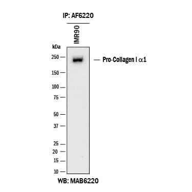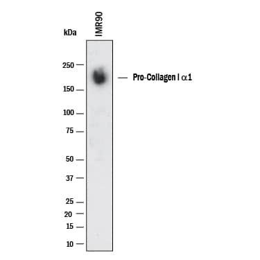 Western blot shows lysates of IMR-90 human lung fibroblast cell line. PVDF membrane was probed with 1 µg/mL of Sheep Anti-Human Pro Collagen I alpha1 Antigen Affinity-purified Polyclonal Antibody (Catalog # AF6220) followed by HRP-conjugated Anti-Sheep IgG Secondary Antibody (HAF016). A specific band was detected for Collagen I at approximately 170 kDa (as indicated). This experiment was conducted under reducing conditions and using Western Blot Buffer Group 1.Pro-Collagen I alpha 1 in IMR‑90 Human Cell Line.