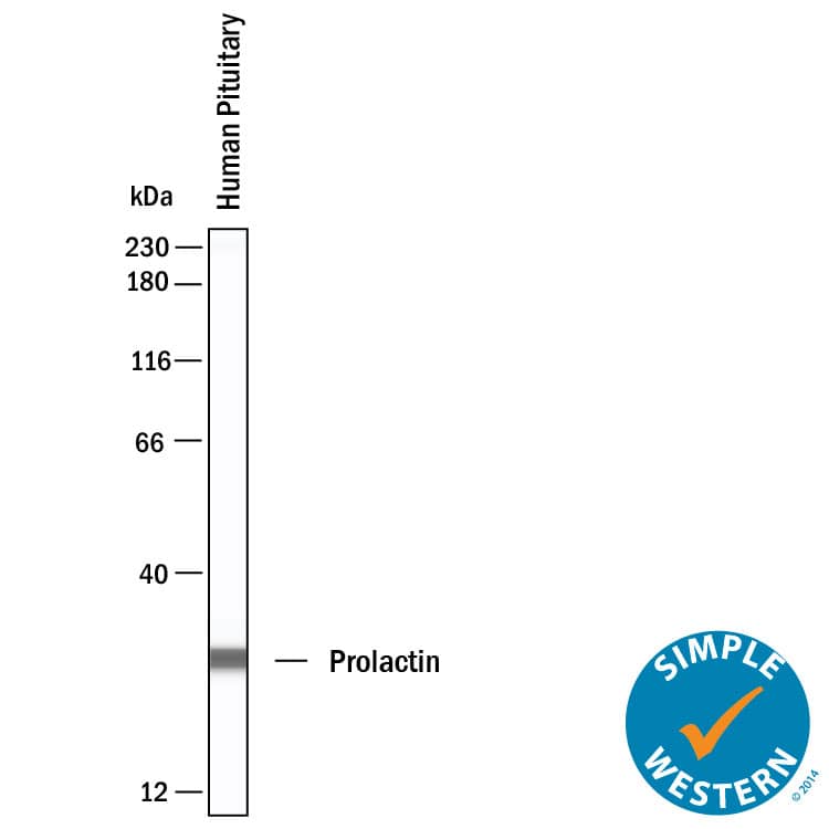 Simple Western shows lysates of human pituitary tissue, loaded at 0.2 mg/ml. A specific band was detected for Prolactin at approximately 29 kDa (as indicated) using 20 µg/mL of Mouse Anti-Human Prolactin Monoclonal Antibody (Catalog # MAB11590). This experiment was conducted under reducing conditions and using the 12-230 kDa separation system.Detection of Prolactin in Human Pituitary.