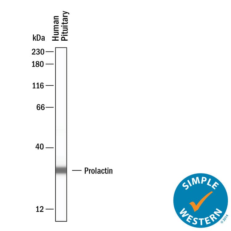 Simple Western shows lysates of human pituitary, loaded at 0.2 mg/ml. A specific band was detected for Prolactin at approximately 30 kDa (as indicated) using 2.5 µg/mL of Goat Anti-Human Prolactin Antigen Affinity-purified Polyclonal Antibody (Catalog # AF682). This experiment was conducted under reducing conditions and using the 12-230kDa separation system.Applications for Human Prolactin Antibody