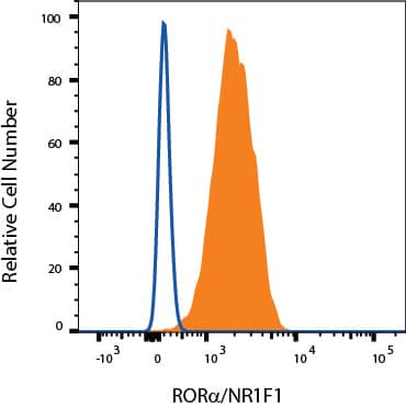 Jurkat cells were stained with Mouse Anti-Human ROR alpha/NR1F1 PE-conjugated Monoclonal Antibody (Catalog # IC8924P, filled histogram) or isotype control antibody (Catalog # IC0041P, open histogram). To facilitate intracellular staining, cells were fixed and permeabilized with FlowX FoxP3 Fixation & Permeabilization Buffer Kit (Catalog # FC012). View our protocol for Staining Intracellular Molecules.Applications for Human ROR alpha/NR1F1 PE-conjugated Antibody