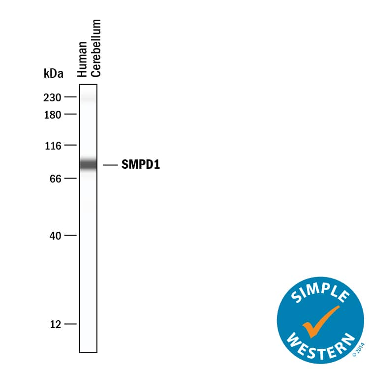 Simple Western lane view shows lysates of human brain (cerebellum), loaded at 0.2 mg/mL. A specific band was detected for SMPD1 at approximately 87 kDa (as indicated) using 50 µg/mL of Goat Anti-Human SMPD1 Antigen Affinity-purified Polyclonal Antibody (Catalog # AF5348) . This experiment was conducted under reducing conditions and using the 12-230 kDa separation system.Applications for Human SMPD1 Antibody