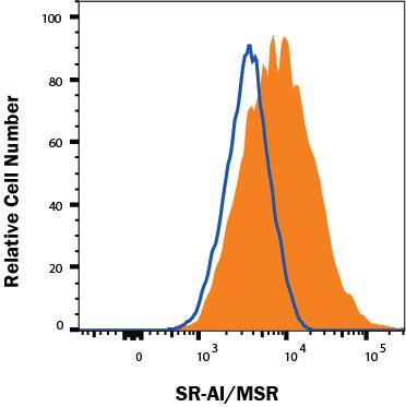 M2 macrophages cells treated with 50 ng/mL Recombinant Human M-CSF Protein (216-MC) for 6 days followed by an overnight polarization with 20 ng/mL Recombinant Human IL-4 Protein (204-IL) and 20 ng/mL Recombinant Human IL-13 Protein (213-ILB) were stained with Mouse Anti-Human SR-AI/MSR PE-conjugated Monoclonal Antibody (Catalog # FAB2708P, filled histogram) or isotype control antibody (Catalog # IC0041P, open histogram). View our protocol for Staining Membrane-associated Proteins.Applications for Human SR-AI/MSR PE-conjugated Antibody