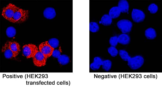 TDAG8/GPR65 was detected in immersion fixed TDAG8/GPR65-transfected HEK293 human embryonic kidney cell line (left panel, positive stain) and non-transfected HEK293 human embryonic kidney cell line (right panel, negative stain) using Mouse Anti-Human TDAG8/GPR65 Monoclonal Antibody (Catalog # MAB10077) at 8 µg/mL for 3 hours at room temperature. Cells were stained using the NorthernLights™ 557-conjugated Anti-Mouse IgG Secondary Antibody (red; NL007) and counterstained with DAPI (blue). Specific staining was localized to cell surfaces. View our protocol for Fluorescent ICC Staining of Non-adherent Cells.Applications for Human TDAG8/GPR65 Antibody