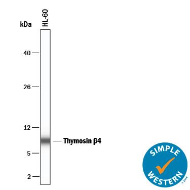Simple Western lane view shows lysates of HL-60 human acute promyelocytic leukemia cell line, loaded at 0.2 mg/mL. A specific band was detected for Thymosin beta4 at approximately 8 kDa (as indicated) using 10 µg/mL of Sheep Anti-Human Thymosin beta4 Antigen Affinity-purified Polyclonal Antibody (Catalog # AF6796) followed by 1:50 dilution of HRP-conjugated Anti-Sheep IgG Secondary Antibody (HAF016). This experiment was conducted under reducing conditions and using the 2-40 kDa separation system.Applications for Human Thymosin beta4 Antibody