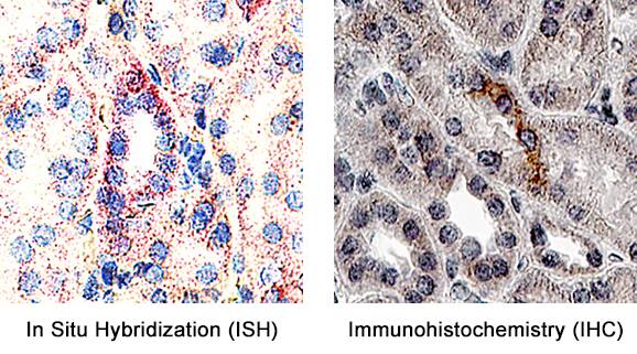 Formalin-fixed paraffin-embedded tissue sections of human kidney were probed for TIM1 mRNA (ACD RNAScope Probe, catalog #452148; Fast Red chromogen, ACD catalog # 322750). Adjacent tissue section was processed for immunohistochemistry using goat anti-human TIM1 polyclonal antibody (R&D Systems catalog # AF1750) at 1ug/mL with 1 hour incubation at room temperature followed by incubation with anti-goat IgG VisUCyte HRP Polymer Antibody (Catalog # VC004) and DAB chromogen (yellow-brown). Tissue was counterstained with hematoxylin (blue). Specific staining was localized to tubules.Applications for Human TIM-1/KIM-1/HAVCR Antibody
