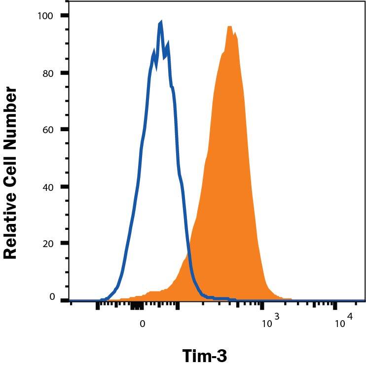 TIM-3 (T cell Immunoglobulin and Mucin domain-3), also known as HAVCR2, is a 60 kDa member of the TIM family of immune regulating molecules. TIMs are type I transmembrane glycoproteins with one Ig-like V-type domain and a Ser/Thr-rich mucin stalk region (1, 2). Mature human TIM-3 consists of a 181 amino acid (aa) extracellular domain (ECD), a 21 aa transmembrane segment, and a 78 aa cytoplasmic tail (3). An alternatively spliced isoform is truncated within the mucin-like stalk. Within the ECD, human TIM-3 shares 58% aa sequence identity with mouse and rat TIM-3. TIM-3 is up‑regulated on several populations of activated myeloid cells (macrophages, monocytes, dendritic cells, microglia, and mast cells) and T cells (Th1, CD8+, NK, and Treg) (3-10). Its binding to Galectin-9 induces a range of immunosuppressive functions which enhance immune tolerance and inhibit anti-tumor immunity (11). TIM-3 ligation attenuates CD8+ and Th1 cell responses (11-13) and promotes the activity of Treg and myeloid derived suppressor cells (8, 11, 13, 14). In addition, dendritic cell-expressed TIM-3 dampens inflammation by enabling the phagocytosis of apoptotic cells and the cross-presentation of apoptotic cell antigens (4). It also binds the alarmin HMGB1, thereby preventing the activation of TLRs in response to released tumor cell DNA (7). TIM-3 interactions with Galectin-9 can alternatively trigger immune stimulatory effects, such as the coactivation of NK cell cytotoxicity (10).
