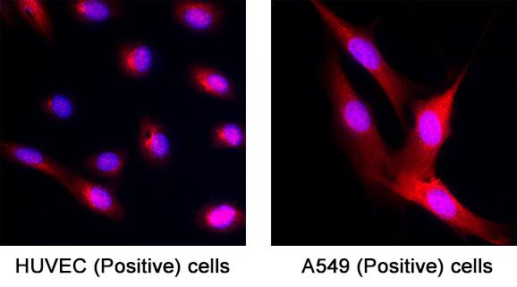 TRIM21 was detected in immersion fixed HUVEC Human Umbilical Vein Endothelial Cells and A549 Human Lung Carcinoma Cells (Both Positive Controls) using Sheep Anti-Human TRIM21 Antigen Affinity-purified Polyclonal Antibody (Catalog # AF6219) at 15 µg/mL for 3 hours at room temperature. Cells were stained using the NorthernLights™ 557-conjugated Anti-Sheep IgG Secondary Antibody (red; Catalog # NL010) and counterstained with DAPI (blue). Specific staining was localized to cytoplasm and cell nuclei. View our protocol for Fluorescent ICC Staining of Cells on Coverslips.Applications for Human TRIM21 Antibody