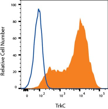 The neurotrophins, including NGF, BDNF, NT-3 and NT-4/5, constitute a group of structurally related, secreted proteins that play an important role in the development and function of the nervous system. The biological activities of the neurotrophins are mediated by binding to and activating two unrelated receptor types: the p75 neurotrophin receptor (p75NTR) and the Trk family of receptor tyrosine kinases (1, 2). P75NTR is a member of the tumor necrosis factor receptor superfamily (TNFRSF) and has been designated TNFRSF16. It binds all neurotrophins with low-affinity to transduce cellular signaling pathways that synergize or antagonize those activated by the Trk receptors. Three Trk family proteins, TrkA, TrkB and TrkC, exhibiting different ligand specificities, have been identified. TrkA binds NGF and NT‑3, TrkB binds BDNF, NT-3 and NT-4/5, and TrkC only binds NT-3 (1, 2). All Trk family proteins share a conserved, complex subdomain organization consisting of a signal peptide, two cysteine-rich domains, a cluster of three leucine-rich motifs, and two immunoglobulin-like domains in the extracellular region, as well as an intracellular region that contains the tyrosine kinase domain (3). Natural splice variants of the different Trks, lacking the first cysteine-rich domain, the first and second or all three of the leucine-rich motifs, or the tyrosine kinase domain, have been described (4). At the protein sequence level, Trks are highly conserved between species with the extracellular domains of human and mouse TrkC's showing 94% amino acid sequence identity (5). The proteins also exhibit cross-species activity. The primary location of TrkC expression is in the nervous system and, specifically, in regions of the CNS. Low level TrkC expression has also been observed in a wide variety of tissues outside the nervous system (6).