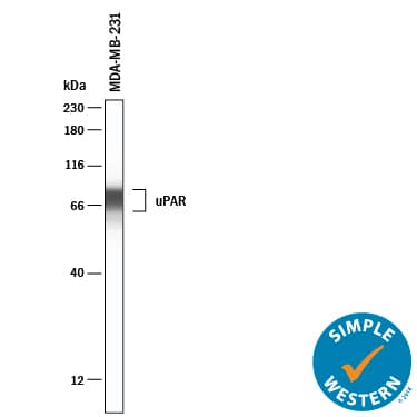 Simple Western lane view shows lysates of MDA-MB-231 human breast cancer cells, loaded at 0.2 mg/mL. A specific band was detected for uPAR at approximately 74 kDa (as indicated) using 20 µg/mL of Goat Anti-Human uPAR Antigen Affinity-purified Polyclonal Antibody (Catalog # AF807). This experiment was conducted under reducing conditions and using the 12-230kDa separation system.Applications for Human uPAR Antibody