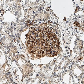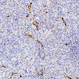 VE-Cadherin was detected in immersion fixed paraffin-embedded sections of human prostate cancer using Rabbit Anti-Human VE-Cadherin Monoclonal Antibody (Catalog # MAB11726) at 0.5 µg/ml for 1 hour at room temperature followed by incubation with the Anti-Rabbit IgG VisUCyte™ HRP Polymer Antibody (Catalog # VC003) or the HRP-conjugated Anti-Rabbit IgG Secondary Antibody (Catalog # HAF008). Before incubation with the primary antibody, tissue was subjected to heat-induced epitope retrieval using VisUCyte Antigen Retrieval Reagent-Basic (Catalog # VCTS021). Tissue was stained using DAB (brown) and counterstained with hematoxylin (blue). Specific staining was localized to the membrane. View our protocol for IHC Staining with VisUCyte HRP Polymer Detection Reagents.Detection of VE-Cadherin in Human Kidney.