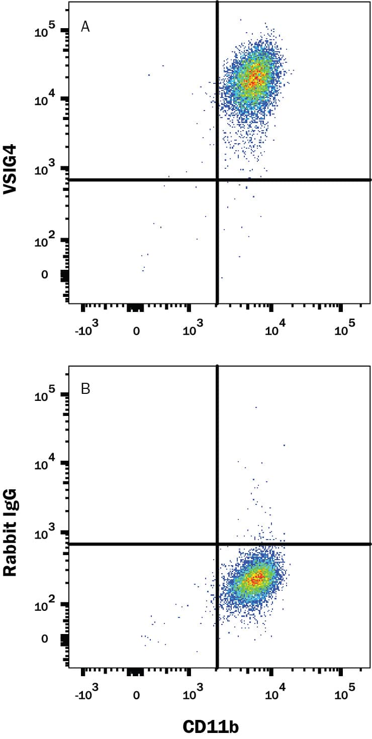 Human CD14+ PBMCs (MAGH105) cultured with 50 ng/ml recombinant human M-CSF (216-MC) and 10 μM Hydrocortisone (4093) for 7 days to generate macrophages were stained with (A) Rabbit Anti-Human VSIG4 Monoclonal Antibody (Catalog # MAB46461) or (B) Rabbit IgG isotype control antibody (MAB1050) followed by anti-Rabbit IgG Allophycocyanin-conjugated secondary antibody (F0111) and Mouse Anti-Human CD11b Phycoerythrin-conjugated Monoclonal Antibody (FAB16991P). Staining was performed using our Staining Membrane-associated Proteins protocol.Applications for Human VSIG4 Antibody