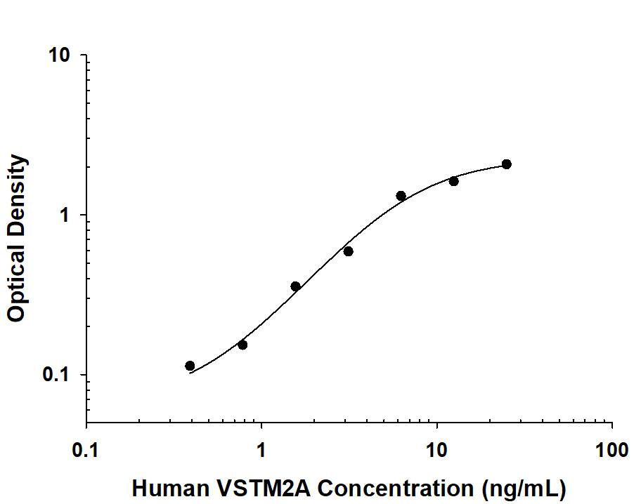 Recombinant Human VSTM2A protein was serially diluted 2-fold and captured by Mouse Anti-Human VSTM2A Monoclonal Antibody (MAB10037) coated on a Clear Polystyrene Microplate (DY990). Mouse Anti-Human VSTM2A Monoclonal Antibody (Catalog # MAB100371) was biotinylated and incubated with the protein captured on the plate. Detection of the standard curve was achieved by incubating Streptavidin-HRP (DY998) followed by Substrate Solution (DY999) and stopping the enzymatic reaction with Stop Solution (DY994).Applications for Human VSTM2A Antibody
