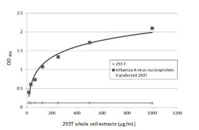 Sandwich ELISA: Influenza A H1N1 Nucleoprotein Antibody (GT1236) [NBP3-13493] - Sandwich ELISA detection of non-transfected and Influenza A virus nucleoprotein transfected 293T whole cell extracts using Influenza A H1N1 Nucleoprotein antibody [GT1236] (NBP3-13493) as capture antibody at concentration of 5 ug/mL and Influenza A H1N1 Nucleoprotein antibody (NBP2-16965) as detection antibody at concentration of 1 ug/mL. Rabbit IgG antibody (HRP) (NBP2-19301) was diluted at 1:10000 and used to detect the primary antibody.