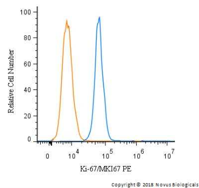 Flow Cytometry: Ki-67/MKI67 Antibody [PE] [NB110-89717PE] - An intracellular stain was performed on U-937 cells with Ki-67/MKI67 Antibody NB110-89717PE (blue) and a matched isotype control (orange). Cells were fixed with 4% PFA and then permeabilized with 0.1% saponin. Cells were incubated in an antibody dilution of 2.5 ug/mL for 30 minutes at room temperature. Both antibodies were conjugated to Phycoerythrin.