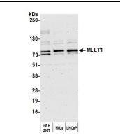 Whole cell lysate (10 µg) from HEK293T, HeLa, and LNCaP cells prepared using NETN lysis buffer. Antibody: Affinity purified rabbit anti-MLLT1 antibody used for WB at 0.04 µg/ml. Detection: Chemiluminescencewith an exposure time of 75 seconds.Applications for MLLT1 Antibody