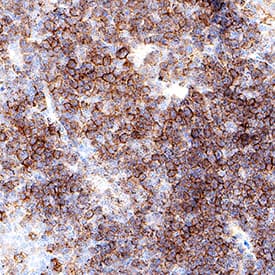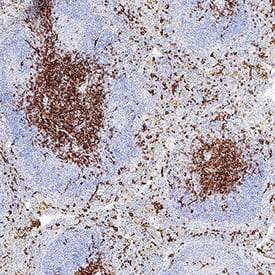 CD8 alpha was detected in perfusion fixed paraffin-embedded sections of mouse spleen using Rat Anti-Mouse CD8 alpha Monoclonal Antibody (Catalog # MAB11715) at 5 µg/ml overnight at 4 °C. Before incubation with the primary antibody, tissue was subjected to heat-induced epitope retrieval using VisUCyte Antigen Retrieval Reagent-Basic (Catalog # VCTS021). Tissue was stained using the HRP-conjugated Anti-Rat IgG Secondary Antibody (Catalog # HAF005) and counterstained with hematoxylin (blue). Specific staining was localized to the membrane. View our protocol for Chromogenic IHC Staining of Paraffin-embedded Tissue Sections.