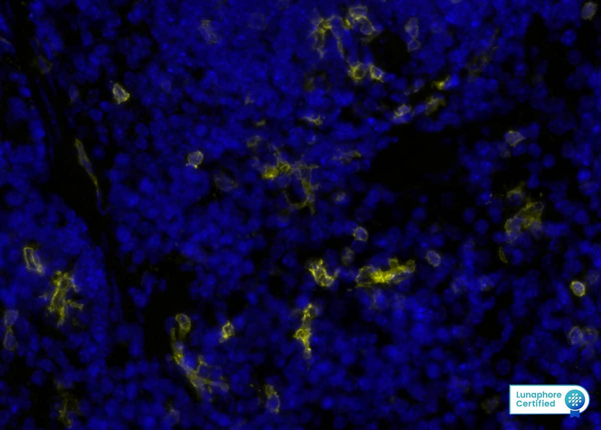 CD8a was detected in perfusion fixed paraffin-embedded sections of mouse spleen using Rat Anti-Mouse CD8a, Monoclonal Antibody (Catalog #MAB11715) at 5ug/mL at 37 ° Celsius for 4 minutes. Before incubation with the primary antibody, tissue underwent an all-in-one dewaxing and antigen retrieval preprocessing using PreTreatment Module (PT Module) and Dewax and HIER Buffer H (pH 9; Epredia Catalog # TA-999-DHBH). Tissue was stained using the Alexa Fluor™ 647 Goat anti-Rat IgG Secondary Antibody at 1:200 at 37 ° Celsius for 2 minutes. (Yellow; Lunaphore Catalog # DR647RT) and counterstained with DAPI (blue; Lunaphore Catalog # DR100). Specific staining was localized to the membrane. Protocol available in COMET™ Panel Builder.
