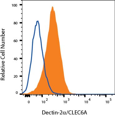 Dectin-2 alpha, also known as CLEC6A, CLECSF10, and NKCL, belongs to the C-type lectin family of transmembrane immune regulatory glycoproteins. Dectin-2 alpha, CLEC4A/DCIR, CLEC4B/DCAR, CLEC4C/DLEC, CLEC4D/MCL, and CLEC4E/mincle constitute a subgroup of these molecules that exhibit approximately 40% amino acid (aa) sequence identity in their extracellular domains (ECD) and have a conserved cysteine spacing in their carbohydrate recognition domains (CRD) (1, 2). Mature mouse Dectin-2 alpha consists of a short cytoplasmic tail, a transmembrane segment, and an ECD with a stalk region and one CRD (3, 4). Alternate splicing leads to partial deletion of the transmembrane segment and stalk ( beta isoform) or a portion of the CRD ( gamma isoform) (4). The full length Dectin-2 alpha isoform is a 27 kDa molecule that is primarily expressed on the surface of tissue macrophages and their precursors (3‑6). The CRD of Dectin-2 alpha contains an EPN motif which is characteristic of calcium-dependent mannose-binding lectins. Dectin-2 alpha selectively interacts with high mannose structures in the Man9GlcNAc2 configuration (7). It mediates the recognition of a variety of microorganisms, particularly the filamentous forms of yeast and fungii (7, 8). The short cytoplasmic tail does not contain signaling motifs but mediates association with the ITAM-containing Fc receptor gamma subunit in macrophages (8). Ligation of Dectin-2 alpha induces tyrosine phosphorylation of the gamma subunit, activation of NF kappaB, and enhanced release of TNF-alpha and IL-1ra (8). Macrophage Dectin-2 alpha is upregulated in vivo by inflammatory stimuli and UV-B irradiation (6). It mediates the breaking of UV-induced tolerance by interacting with CD4+CD25+ regulatory T cells which then induce dendritic cells to release IL-4, IL-10, and TGF-beta (9). Within the ECD, mouse Dectin-2 alpha shares 71% aa sequence identity with human and bovine Dectin-2.