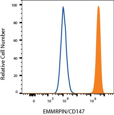 J774A.1 cells were stained with Rabbit Anti-Mouse EMMPRIN/CD147 Monoclonal Antibody (Catalog # MAB7721, filled histogram) or isotype control antibody (Catalog # MAB1050, open histogram) followed by Phycoerythrin-conjugated Anti-Rabbit IgG Secondary Antibody (Catalog # F0110). View our protocol for Staining Membrane-associated Proteins.Applications for Mouse EMMPRIN/CD147 Antibody
