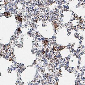 Fc gamma RIIIB/CD16b was detected in immersion fixed paraffin-embedded sections of mouse liver using Rabbit Anti-Mouse Fc gamma RIIIB/CD16b Monoclonal Antibody (Catalog # MAB11667) at 0.1 µg/ml for 1 hour at room temperature followed by incubation with the Anti-Rabbit IgG VisUCyte™ HRP Polymer Antibody (Catalog # VC003) or the HRP-conjugated Anti-Rabbit IgG Secondary Antibody (Catalog # HAF008). Before incubation with the primary antibody, tissue was subjected to heat-induced epitope retrieval using VisUCyte Antigen Retrieval Reagent-Basic (Catalog # VCTS021). Tissue was stained using DAB (brown) and counterstained with hematoxylin (blue). Specific staining was localized to the cell surface of Kupffer cells. View our protocol for IHC Staining with VisUCyte HRP Polymer Detection Reagents.