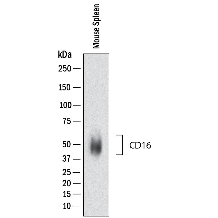 Western Blot shows lysates of mouse spleen tissue. PVDF membrane was probed with 2 µg/ml of Rabbit Anti-Mouse Fc gamma RIIIB/CD16b Monoclonal Antibody (Catalog # MAB11667) followed by HRP-conjugated Anti-Rabbit IgG Secondary Antibody (Catalog # HAF008). A specific band was detected for Fc gamma RIIIB/CD16b at approximately 40-60 kDa (as indicated). This experiment was conducted under reducing conditions and using Western Blot Buffer Group 1.