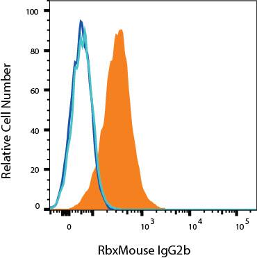 Human PBMC lymphocytes were stained with Mouse anti-Human DTK Monoclonal Antibody (Catalog # MAB859, Mouse IgG1 isotype; aqua histogram), Mouse anti-Human MICA Monoclonal Antibody (Catalog # MAB13001, Mouse IgG2A isotype; dark blue histogram), or Mouse anti-Human MICA Monoclonal Antibody (Catalog # MAB1300, Mouse IgG2B isotype; orange histogram), followed by Rabbit anti-Mouse IgG2B-specific secondary antibody (Catalog # MAB9636) then APC-conjugated Goat anti-Rabbit secondary antibody (Catalog # F0101B). View our protocol for Staining Membrane-associated Proteins.Applications for Mouse IgG2B Antibody