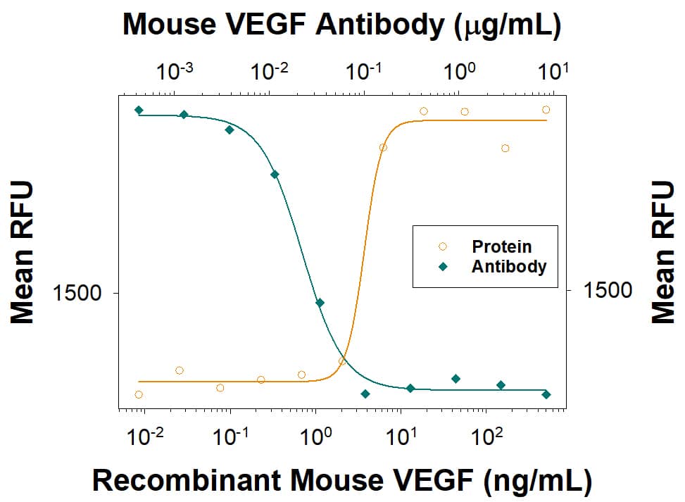 Recombinant Mouse VEGF164 (Catalog # 493-MV) stimulates proliferation in HUVEC human umbilical vein endothelial cells in a dose-dependent manner (orange line), as measured by Resazurin (AR002). Proliferation elicited by Recombinant Mouse VEGF164 (10 ng/mL) is neutralized (green line) by increasing concentrations of Goat Anti-Mouse VEGF164 Antigen Affinity-purified Polyclonal Antibody (Catalog # AF-493-NA). The ND50 is typically <0.15 µg/mL.Applications for Mouse VEGF164 Antibody