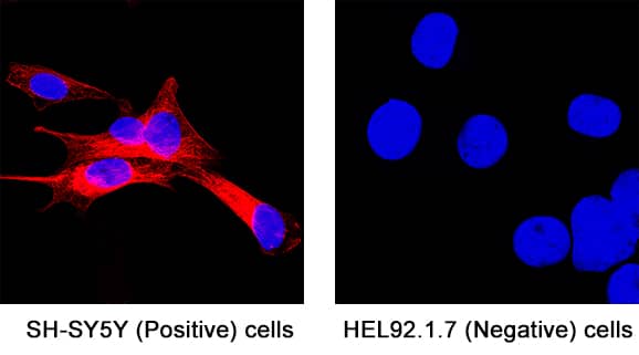 Sample: Immersion fixed rat cortical stem cells, rat cortical neurons, SH-SY5Y human neuroblastoma cells (Positive) and HEL 92.1.7 human erythroleukemic cell line (Negative)