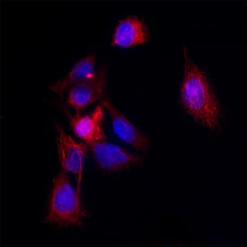 Nitrotyrosine was detected in immersion fixed A549 human lung carcinoma cells using Mouse Anti-Nitrotyrosine Monoclonal Antibody (Catalog # MAB3248) at 8 µg/mL for 3 hours at room temperature. Cells were stained using the NorthernLights™ 557-conjugated Anti-Mouse IgG Secondary Antibody (red; Catalog # NL007) and counterstained with DAPI (blue). Specific staining was localized to Cytoplasmic. View our protocol for Fluorescent ICC Staining of Cells on Coverslips.Applications for Nitrotyrosine Antibody