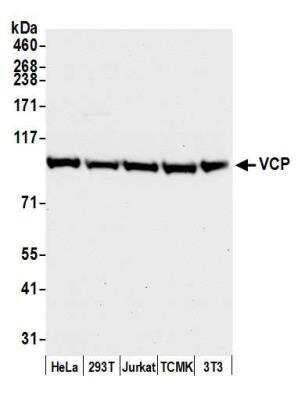p97/VCP Antibody [NB100-1557] - Detection of human and mouse VCP by western blot. Samples: Whole cell lysate (50 ug) from HeLa, HEK293T, Jurkat, mouse TCMK-1, and mouse NIH 3T3 cells prepared using NETN lysis buffer. Antibody: Affinity purified rabbit anti-VCP antibody NB100-1557 used for WB at 0.1 ug/ml. Detection: Chemiluminescence with an exposure time of 10 seconds.