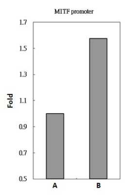 Chromatin Immunoprecipitation: POU3F2/OCT7 Antibody [NBP2-21585] - Sample: 293T whole cell lysate/extract A. 5 ug preimmune rabbit IgG B. 5 ug of OCT7 antibody The precipitated DNA was detected by PCR with primer set targeting to MITF promoter.