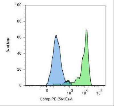 Flow Cytometry: PSMA/FOLH1/NAALADase I Antibody (GCP-05) [PE] [NBP1-45056] - Surface staining (flow cytometry) of GCPII / PSMA using anti-GCPII (GCP-05) and goat anti-mouse-PE on LNCaP cell line (positive, green) and HeLa cells (negative, blue).