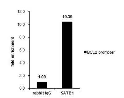 Chromatin Immunoprecipitation: SATB1 Antibody [NBP2-15107] - Cross-linked ChIP was performed with Jurkat chromatin extract and 5 ug of either control rabbit IgG or anti-SATB1 antibody. The precipitated DNA was detected by PCR with primer set targeting to BCL2 promoter.ChIP experiment and primer designs are based on Nucleic Acids Res. 2011 Jun;39(11):4640-52.