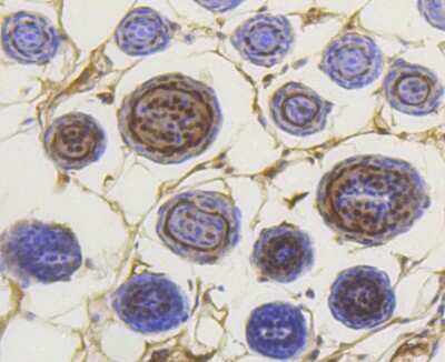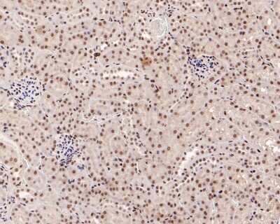 Immunohistochemistry-Paraffin: Smad3 [p Ser423, p Ser425] Antibody (ST0493) [NBP2-67513] - Analysis of paraffin-embedded mouse kidney tissue with Rabbit anti-Phospho-Smad3 [p Ser423, p Ser425) antibody washed with ddH2O and PBS, and then probed with the primary antibody at 1/500 dilution for 1 hour at room temperature. The detection was performed using an HRP conjugated compact polymer system. DAB was used as the chromogen. Tissues were counterstained with hematoxylin and mounted with DPX.