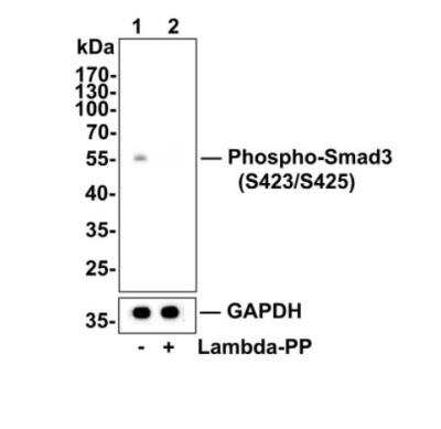Western Blot: Smad3 [p Ser423, p Ser425] Antibody (ST0493) [NBP2-67513] - Analysis of Smad3 [p Ser423, p Ser425] on A549 cell lysates. Lane 1 : A549 cells, whole cell lysate, 10 ug /lane. Lane 2 : A549 cells were treated with 5 ng/ml TGF beta1 for 24 hours, whole cell lysates, 10 ug/lane. Proteins were transferred to a PVDF membrane and blocked with 5% BSA in PBS for 1 hour at room temperature. The primary antibody Anti-Smad3 [p Ser423, p Ser425] (1/500) , Anti-Smad3 antibody (1/500) and Anti-GAPDH antibody (1/10,000)was used in 5% BSA at room temperature for 2 hours. Goat Anti-Rabbit IgG H&L (HRP) Secondary Antibody at 1:200,000 dilution was used for 1 hour at room temperature. Predicted band size: 48 kDa Observed band size: 60 kDa Exposure time: 3 seconds