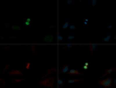Immunocytochemistry/Immunofluorescence: Survivin [p Ser20] Antibody [NB110-92717] - Survivin [p Ser20] Antibody (NB110-92717) was tested in Hela cells with DyLight 488 (green). Nuclei and alpha-tubulin were counterstained with DAPI (blue) and DyLight 550 (red).